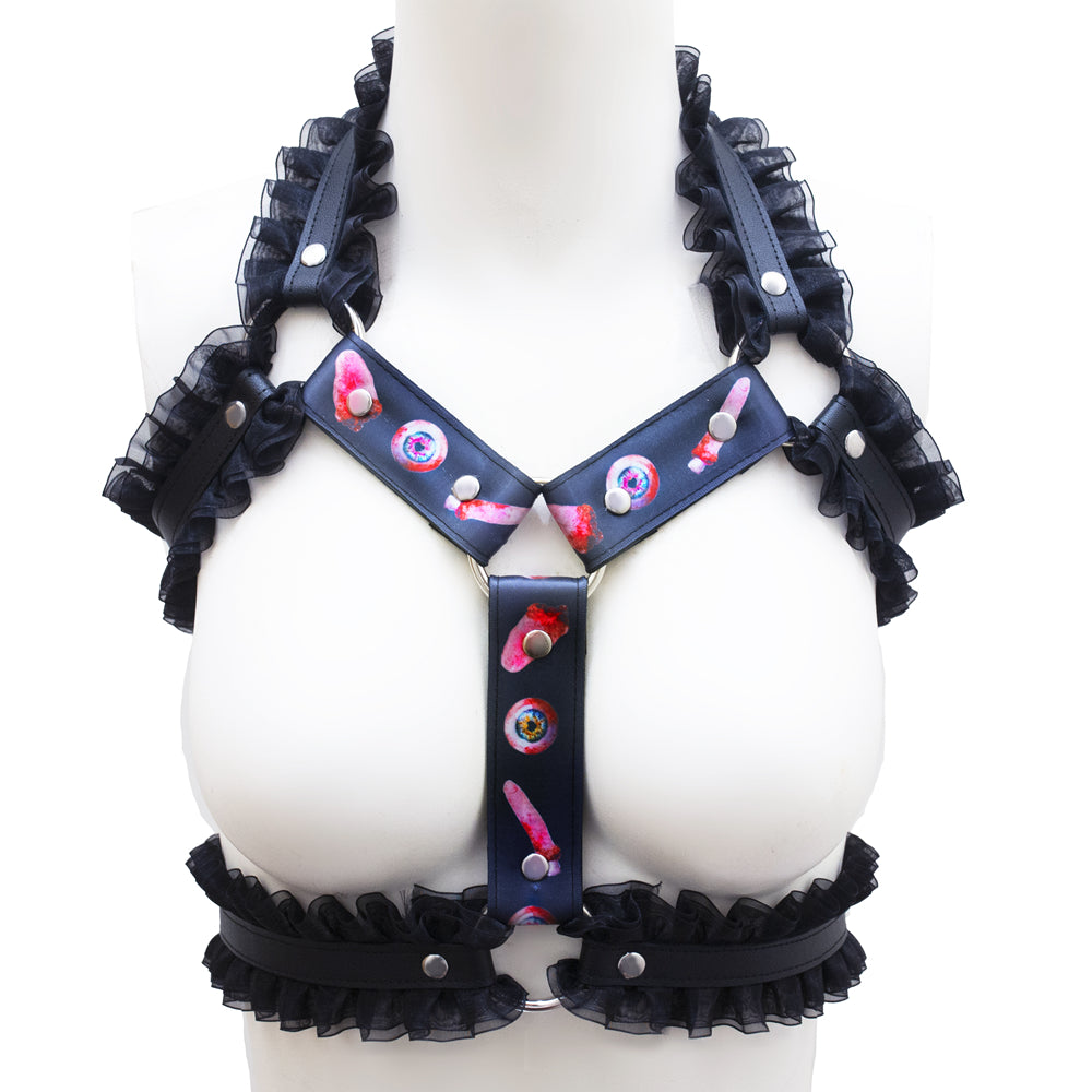 Dare to make a statement with this wickedly bold harness featuring an edgy print of intertwined fingers, eyeballs, and a playful tongue. The delicate lace trim adds an unexpected touch of elegance to this daring piece, creating the perfect balance between naughty and nice. Whether you're turning heads at an underground event or simply embracing your darker aesthetic, this harness ensures you'll be unforgettable. Perfect for those who refuse to blend in and love to provoke a double-take. Get ready to own the room.